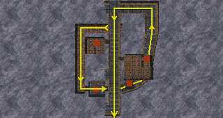 Go up the stairs to the south (a warrior-type is waiting for you). Follow this corridor until you get to a door on your right (north). Go through this room (a human and an animal occupy the room) and out the west door. Follow the corridor until you get to a 4-way junction with a dead-end (and a warrior-type) in front of you. Turn left (west). |