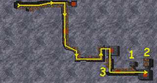 Follow the corridor to its end. There will be a door in front of you (east) and a door to your left (north). Through the eastern door is a room with a bad guy. The lever in room 1 should open a door in the corridor above you. The lever in room 2 unlocks an elevator. Now go back to the elevator shaft (3) and take it up (it's already at the top when you get to it). |