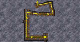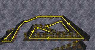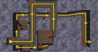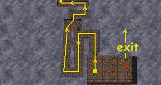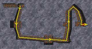 Go through the door, turn left (east), and follow the passage. Take the first right (east) passageway and go down. When you get to the 4-way intersection, go right (north). |