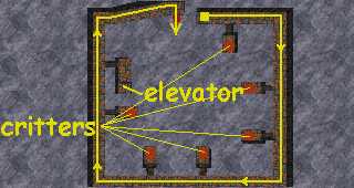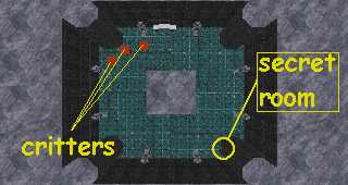 At the T-intersection, go left (north). At the 4-way intersection, go right (east). Follow the passage around, go through any doors in front of you, go through the next 4-way and go through the first door on your left (east). Critters will be jumping out of the rooms that you pass. |