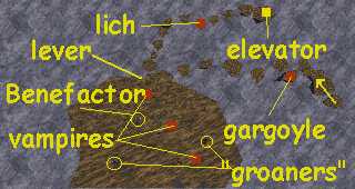 You will arrive at the head of a path of floating stones that leads to an opening in a large island. There are two vampires and a Vampire Ancient on the island. Clicking on the two "groaning" headstones opens trapdoors inside the big pyramid. Click gently because it's possible to open and close a trapdoor with a single click. Clicking on the white headstone tells you about some guy named Benefactor, "whose body guards the way". The lever at the front of the chamber in the island controls an elevator down to the next stone path. The lever at the back opens a passage at the top of this big room. Take the elevator down to the next path of stones, dispose of the lich and ride the elevator at the end all of the way to the top. |