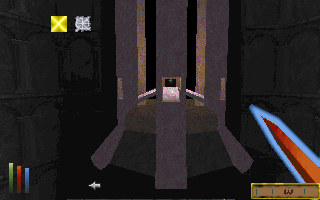 You're now in a dark passageway. If you look west you'll see a series of pits in the floor. Jump over them or levitate over them (levitate is best - you'll need it in a minute). Drop down the last pit and kill the Vampire Ancient if you're feeling feisty. Float down the corridor until you get to a big chamber with a shrine-looking set-up in the middle.
