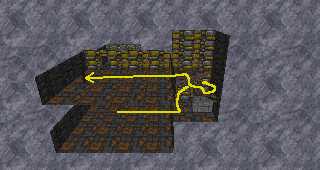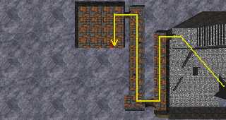Run down to the end of the entrance hallway to draw the Skeletal Warriors away from the door. Wait until you hear them on the other side of the wall and then go back to the door. Levitate (or walk) across to the landing diagonally across from you (something will probably come through the door) and turn the wheel. This moves a stone plug farther down the entrance hallway. |