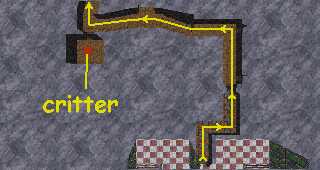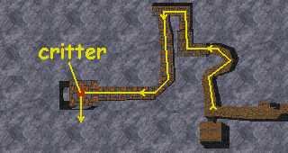 Follow the passage up the stairs and down the other side. There is a random critter in the small room to the left. If it is capable of opening doors, it will try to come out and play with you (isn't it nice to be popular?).