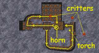 There is a critter directly in front of you, but it's the one at the end of the right-hand passage that usually manages to get in a good backstab before you know it's there. After getting rid of your friends, turn left and go up the ramp to another landing, where you will go north. In the room at the end of this passage is another critter (playmates all over the place, huh?). The door you need is in the south wall, but it's a "secret" door and difficult to see. The horn will be on the bed. Retrieve it and take it back to Medora.