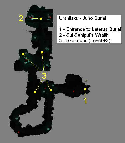 Providing a readable 2-dimentional map for this 3-dimensional space is difficult at best. What you are wanting to do is make your way up the winding ramp to the top of the chamber where you'll find a door leading to Juno Burial. There are no creatures in this chamber, so you won't be fighting anything. There are several very nifty items placed here, but getting to them is a major problem. A Levitate potion or spell is a requirement if you want to do anything other than get to the other chambers. In no particular order, you should be able to find: