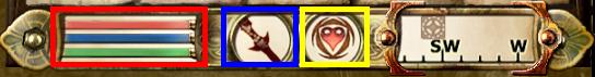 Selecting the red section will open your journal to your character information, selecting the blue section will open your journal to your inventory information, selecting the yellow section will open your journal to your spell information, and selecting the compass (the part that is currently selected in the image) will open your journal to the maps and journal section.